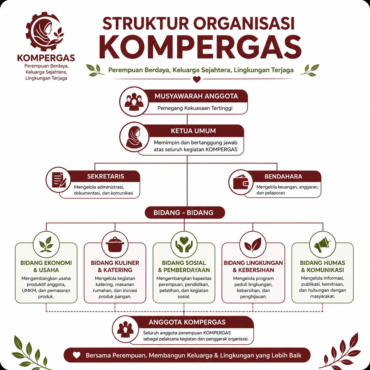 Dengan semangat kebersamaan, KOMPERGAS mendorong peran perempuan sebagai agen perubahan yang mampu menciptakan peluang, memperkuat solidaritas sosial, serta memberikan kontribusi nyata bagi lingkungan sekitar. Melalui program-program seperti usaha rumahan, kegiatan sosial, hingga edukasi pengelolaan sumber daya, KOMPERGAS berkomitmen untuk membangun masyarakat yang lebih mandiri, sehat, dan sejahtera.